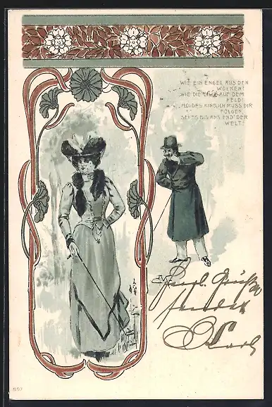 Lithographie Frau in Ausgehkleidung mit Wanderstock, ein Mann hinter ihr, Jugendstil