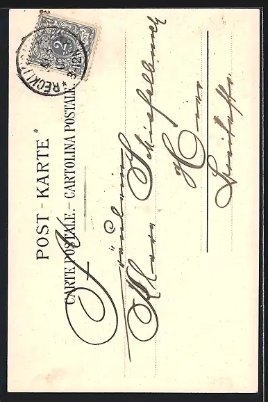 Personenbezogene Daten auf der Rückseite der Karte wurden durch blauen Textmarker unkenntlich gemacht. Die blauen Stellen sind auf die Vorderseite durchgeweicht und wirken sich negativ auf das Postkartenfoto aus