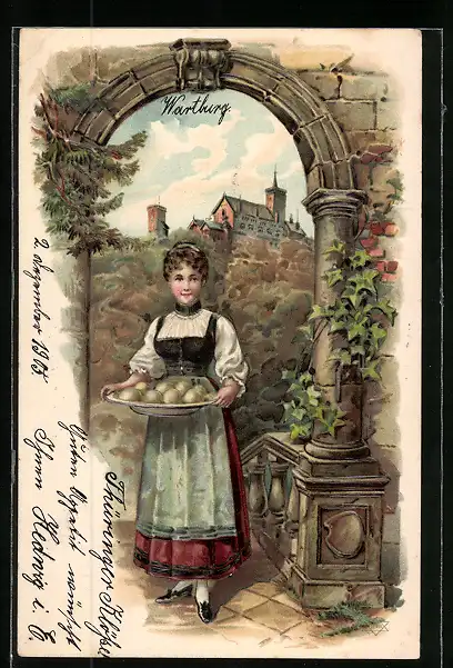 Personenbezogene Daten auf der Rückseite der Karte wurden durch blauen Textmarker unkenntlich gemacht. Die blauen Stellen sind auf die Vorderseite durchgeweicht und wirken sich negativ auf das Postkartenfoto aus