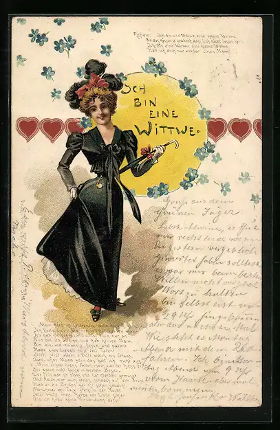 Lithographie Frau in tailliertem schwarzen Kleid, Liedtext zu Ich bin eine Witwe