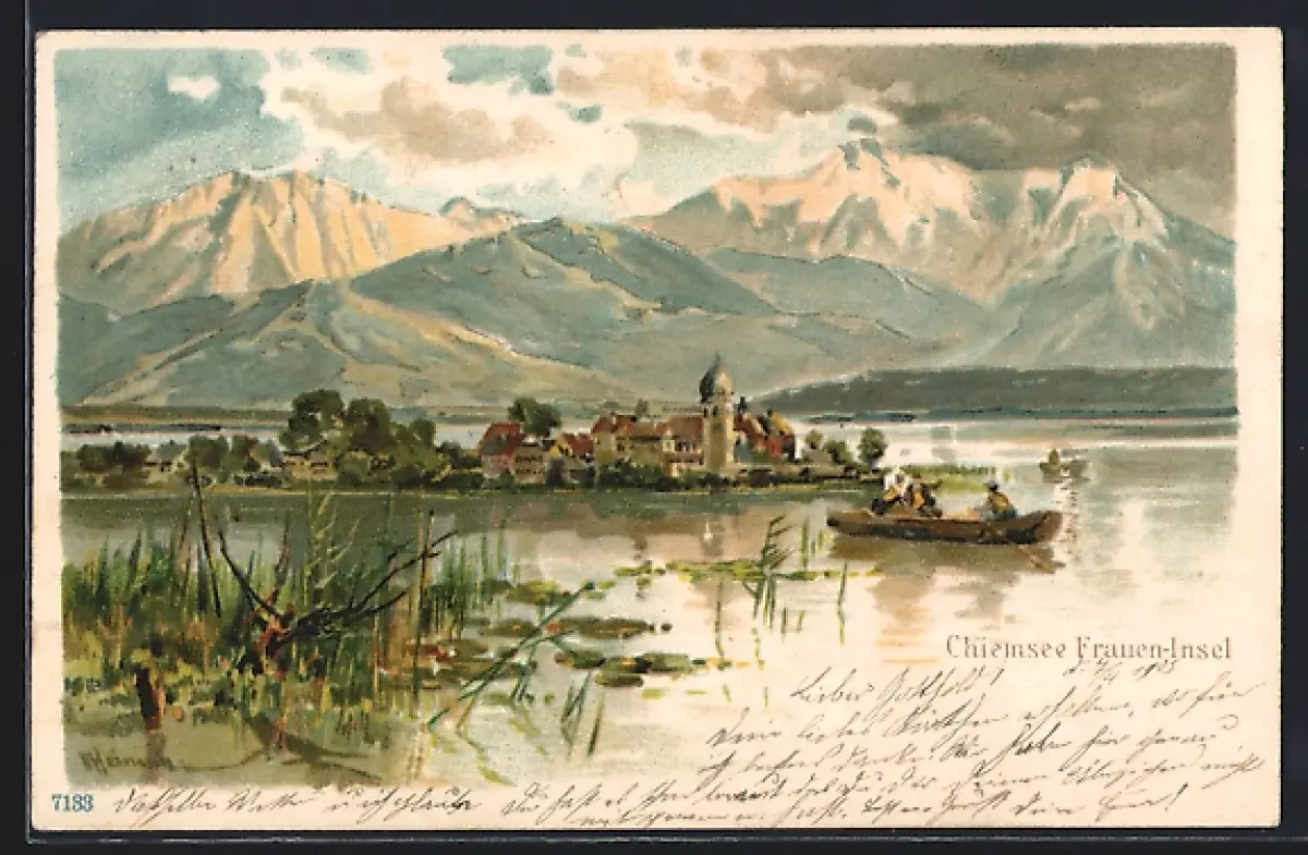 Lithographie Frauen-Insel /Chiemsee, Blick zur Frauen-Insel