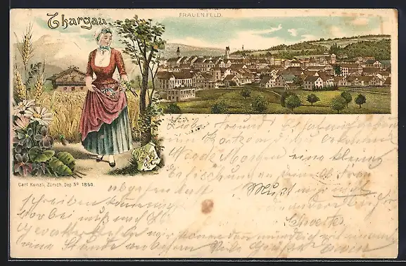 Lithographie Frauenfeld, Ortsansicht und Dame in Sommerkleid