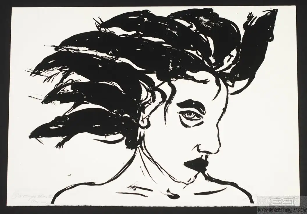 Bemerkungen: Zustand: Schönes sauberes Blatt // Vorabdruck, unten rechts signiert. Kunstgrafik. Druckgröße: 42 x 30 cm, Angela Hampel (*1956 Räckelwitz, lebt und arbeitet in Dresden). Deutsche Malerin und Grafikerin. Lehre und Arbeit als Forstfacharbeiterin. 1977-82 Studium an der HfBK Dresden bei Jutta Damme und D. Büttner. Danach freischaffend. Mitbegründerin der Dresdner Sezession '89
