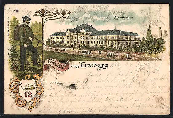 Lithographie Freiberg / Sachsen, Jäger-Kaserne mit Strassenpartie, Sächsischer Jäger Rgt. 12 im Wald