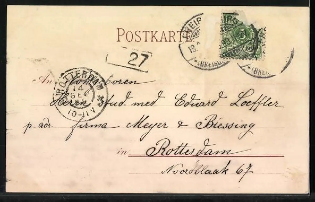 Personenbezogene Daten auf der Rückseite der Karte wurden durch blauen Textmarker unkenntlich gemacht. Die blauen Stellen sind auf die Vorderseite durchgeweicht und wirken sich negativ auf das Postkartenfoto aus