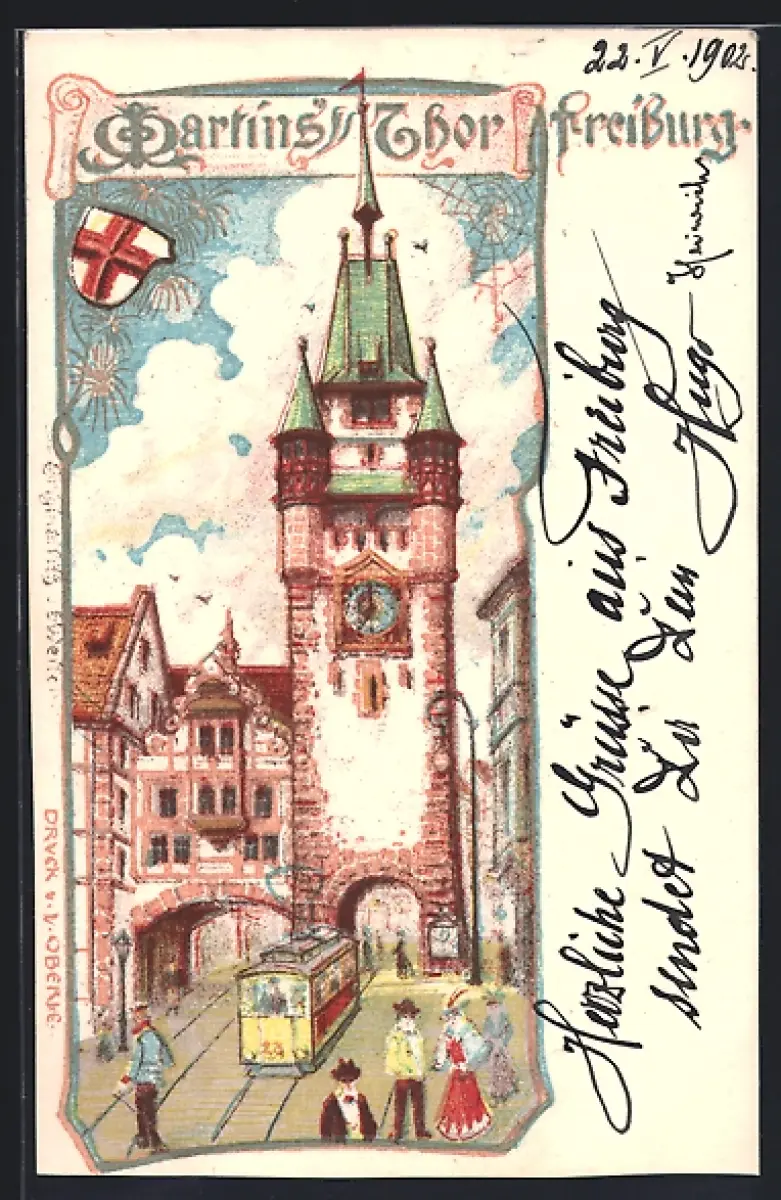 Lithographie Freiburg / Breisgau, Martins-Tor mit Strassenbahn