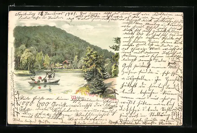 Lithographie Freiburg /Breisgau, Waldsee mit Booten