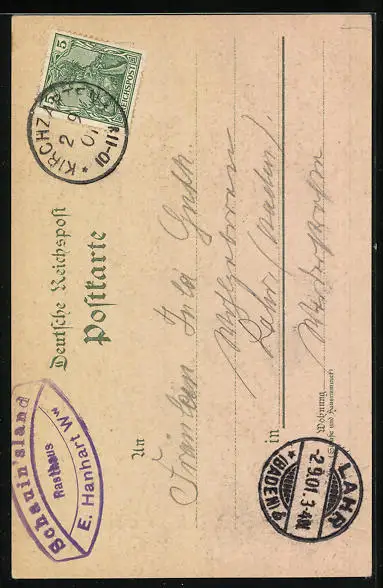 Personenbezogene Daten auf der Rückseite der Karte wurden durch blauen Textmarker unkenntlich gemacht. Die blauen Stellen sind auf die Vorderseite durchgeweicht und wirken sich negativ auf das Postkartenfoto aus