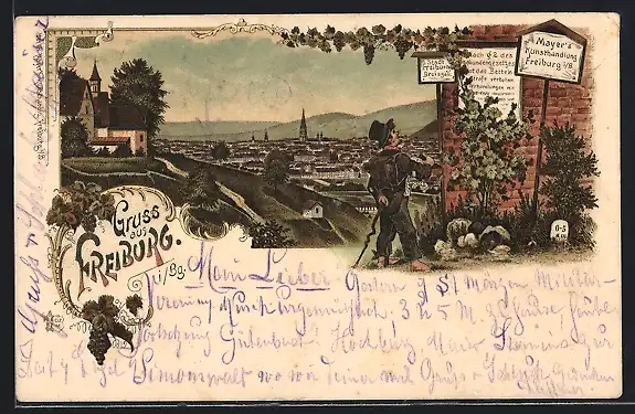 Lithographie Freiburg i. B., Ortspanorama, Wanderer vor Ortsschildern stehend