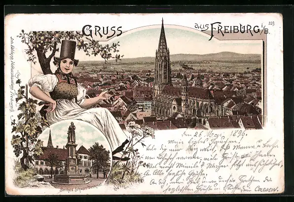 Lithographie Freiburg i. B., Teilansicht mit Münster, Berthold Schwarz-Denkmal