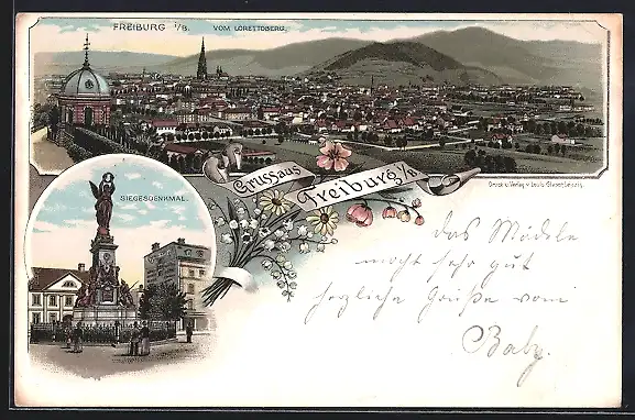 Lithographie Freiburg i. B., Totalansicht vom Lorettoberg und Siegesdenkmal