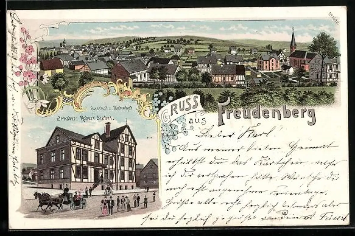 Lithographie Freudenberg / Siegen, Gasthof zum Bahnhof, Inh. Robert Siebel, Totalansicht