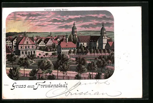 Lithographie Freudenstadt, Postamt und evang. Kirche