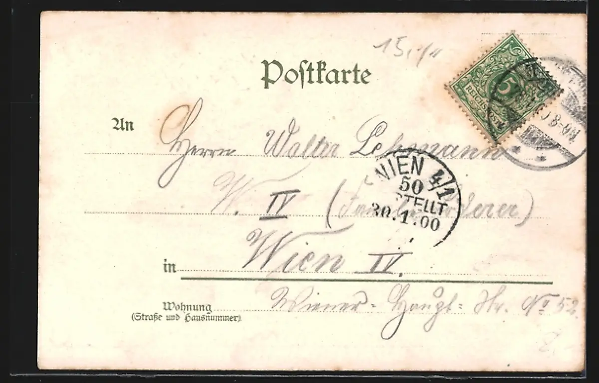 gelaufen 1900, vorderseitig Klebe- und Papierreste, Albumspuren, guter Zustand