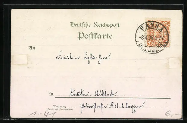 gelaufen 1898, rückseitig Klebe- und Papierreste, guter Zustand