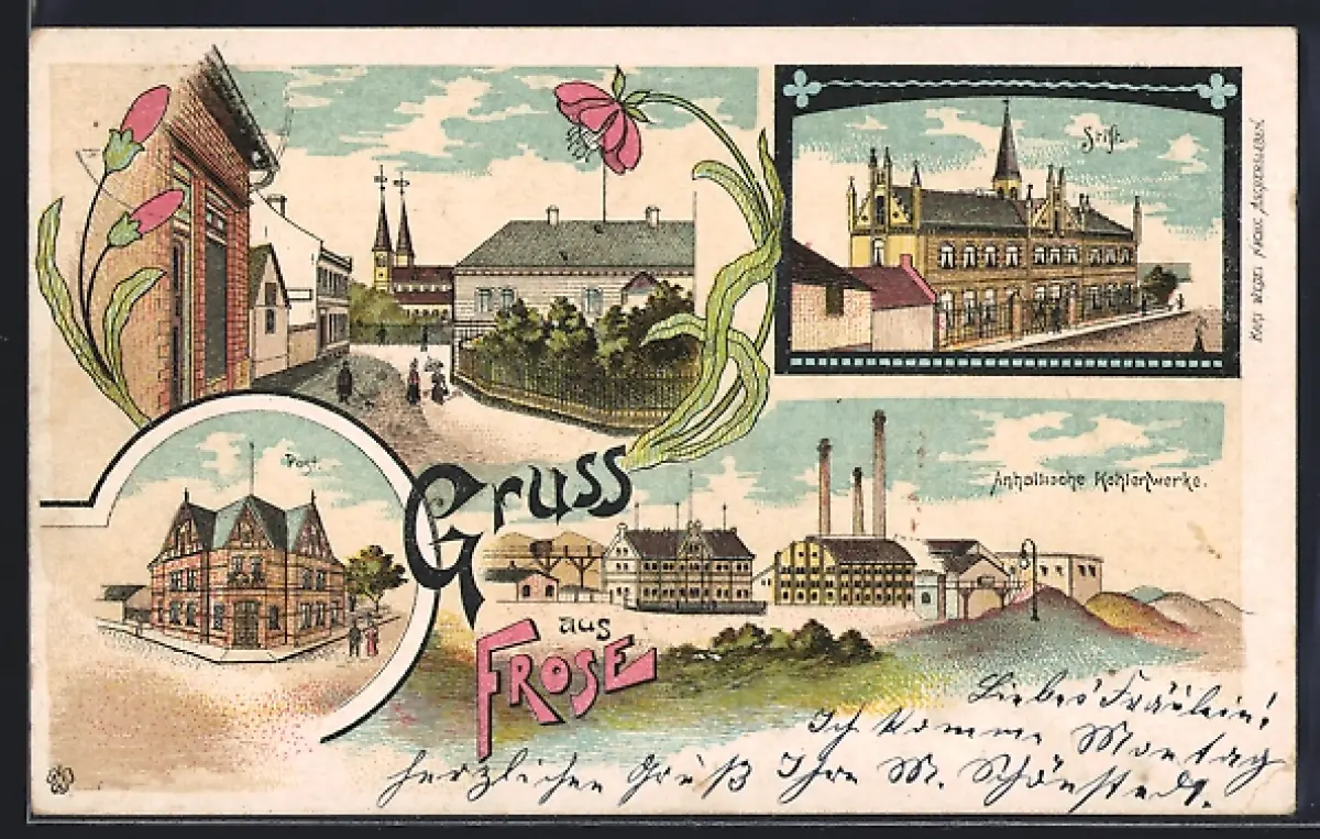 Lithographie Frose, Anhaltische Kohlenwerke, Stift, Post, Ortsansicht