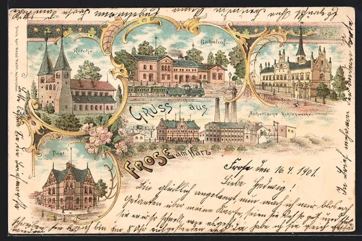 Lithographie Frose, Bahnhof, Eisenbahn, Bendix-Stift, Anhaltische Kohlenwerke, Postamt