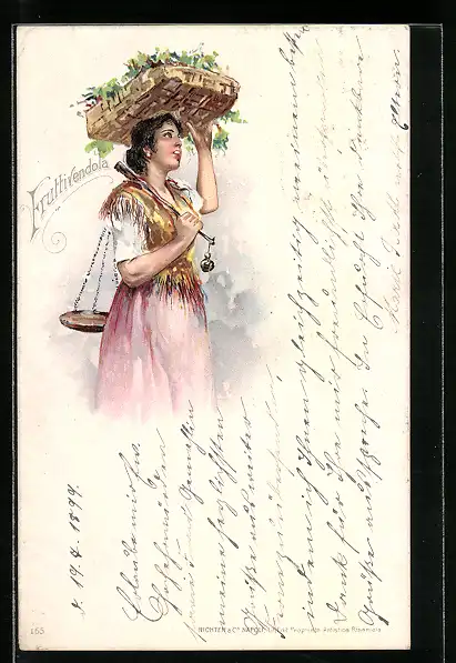 Lithographie Fruttivendola, Markthändlerin mit Gemüse und Waage