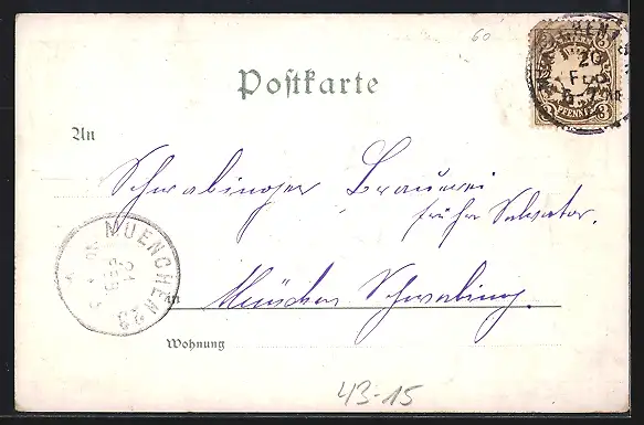 Personenbezogene Daten auf der Rückseite der Karte wurden durch blauen Textmarker unkenntlich gemacht. Die blauen Stellen sind auf die Vorderseite durchgeweicht und wirken sich negativ auf das Postkartenfoto aus