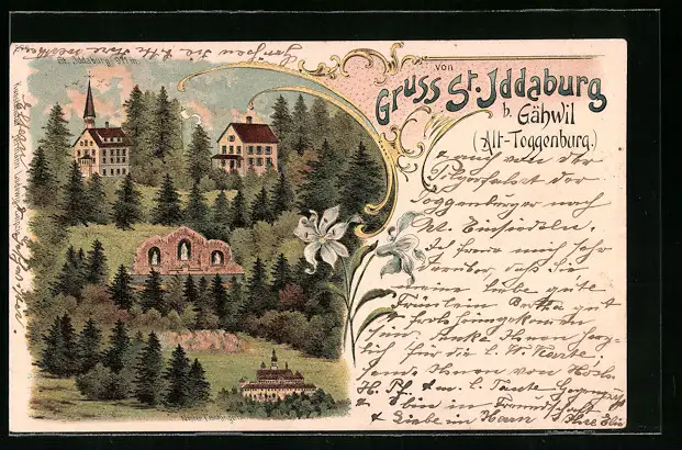 Lithographie Gähwil /Alt-Toggenburg, St. Iddaburg, Ortspartie mit Kirche