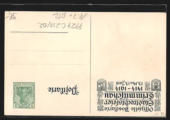 Lithographie Ganzsache PP27C258 /02: Alt-Crimmitschau, Stadtrechtsfeier 1914, Oberes Tor und Wappen