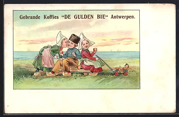 Lithographie Gebrande Koffies De Gulden Bie, Antwerpen, Kaffee-Reklame, Holländer in Tracht