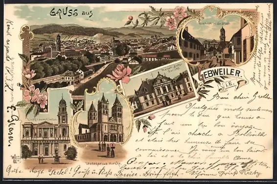 Lithographie Gebweiler, Ortsansicht, Amts-Gericht, Leodegarius Kirche, Liebfrauen Kirche