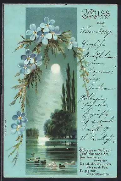 Lithographie Gedicht über einen See voller Ansichtskarten