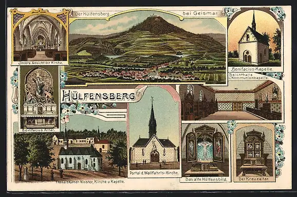 Lithographie Geismar / Eichsfeld, Ortsansicht mit Hülfensberg, Franziskaner-Kloster, Kirche, Kapelle