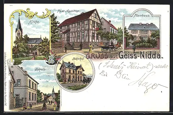 Lithographie Geiss-Nidda, Post-Agentur, Kirche, Pfarrhaus, Schule