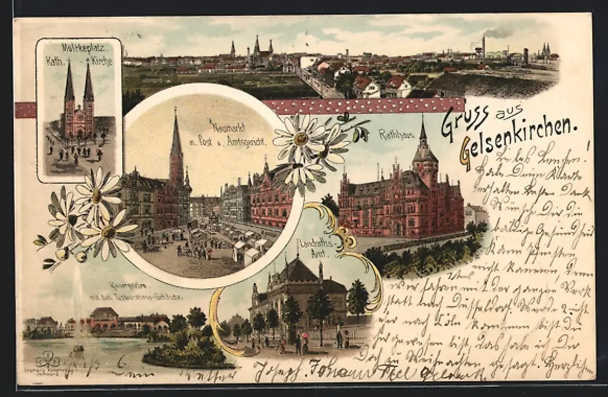 Lithographie Gelsenkirchen, Moltkeplatz, Neumarkt, Post, Amtsgericht, Kaisergarten
