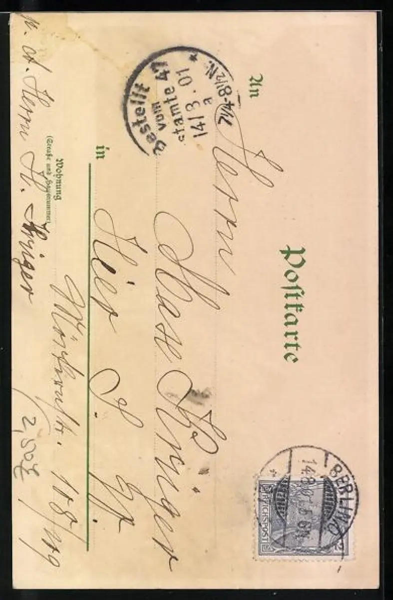 Personenbezogene Daten auf der Rückseite der Karte wurden durch blauen Textmarker unkenntlich gemacht. Die blauen Stellen sind auf die Vorderseite durchgeweicht und wirken sich negativ auf das Postkartenfoto aus