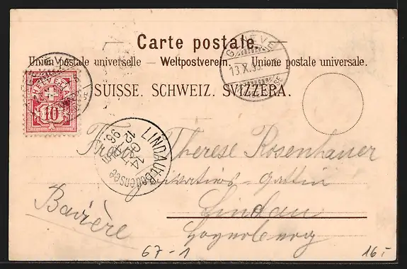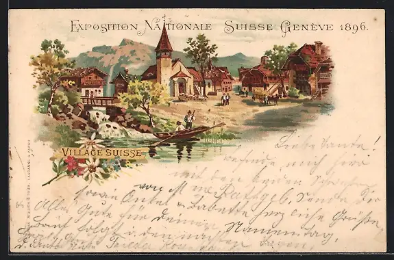 Lithographie Geneve, Exposition Nationale Suisse 1896, Village Suisse, Ruderboot, Pferdewagen