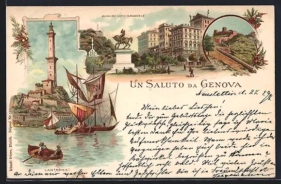 Lithographie Genova, Monumento Vitto Emanuele, Fort Sperone, Lanterna