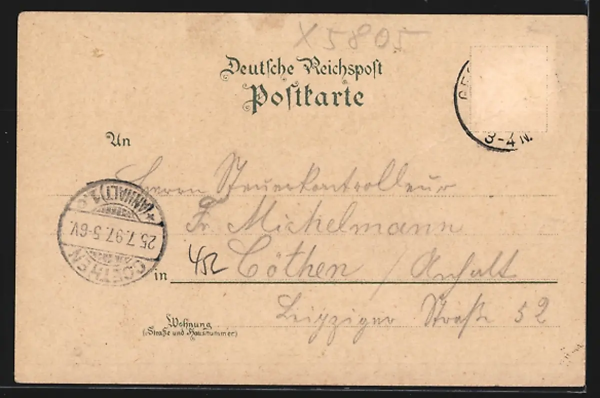 gelaufen 1897, Briefmarke entfernt, rückseitig Oberflächenschaden, Eckknicke re. oben, Bugspuren li. oben u. re. mittig, guter Zustand