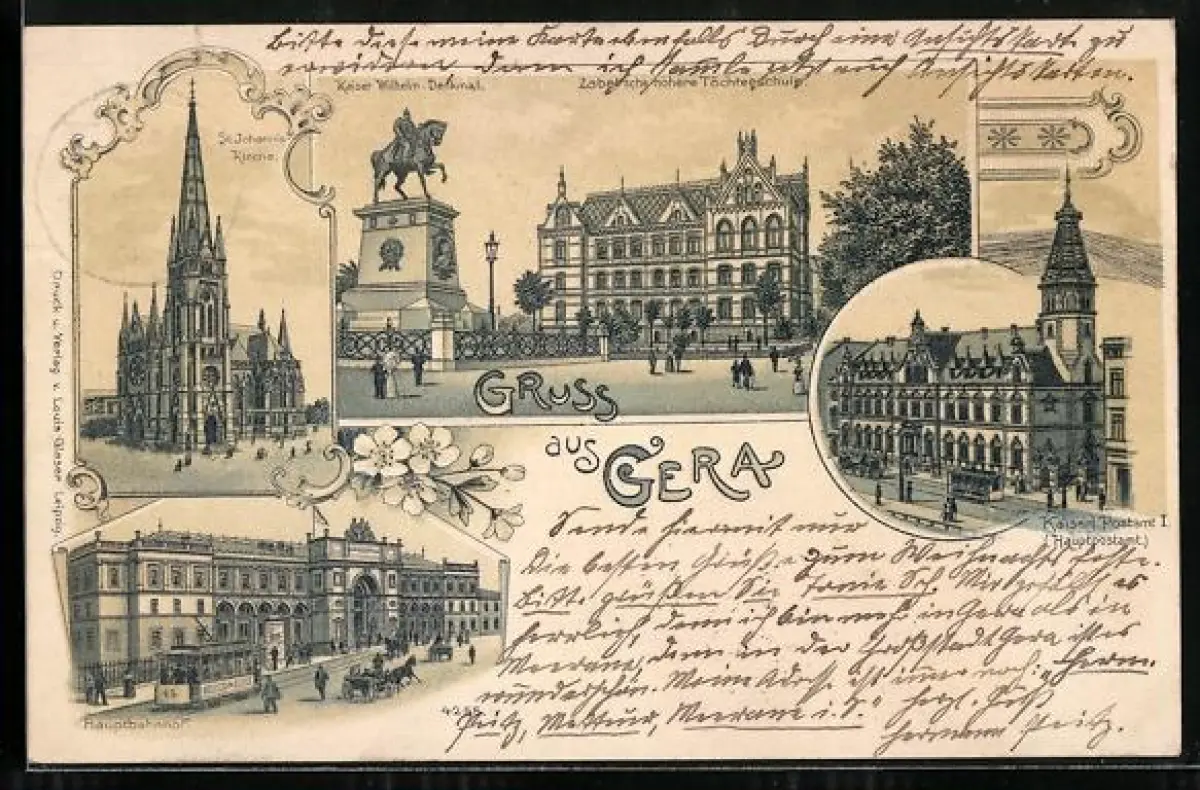 Lithographie Gera, Hauptbahnhof, Hauptpostamt, Zabel'sche höhere Töchterschule, Kirche