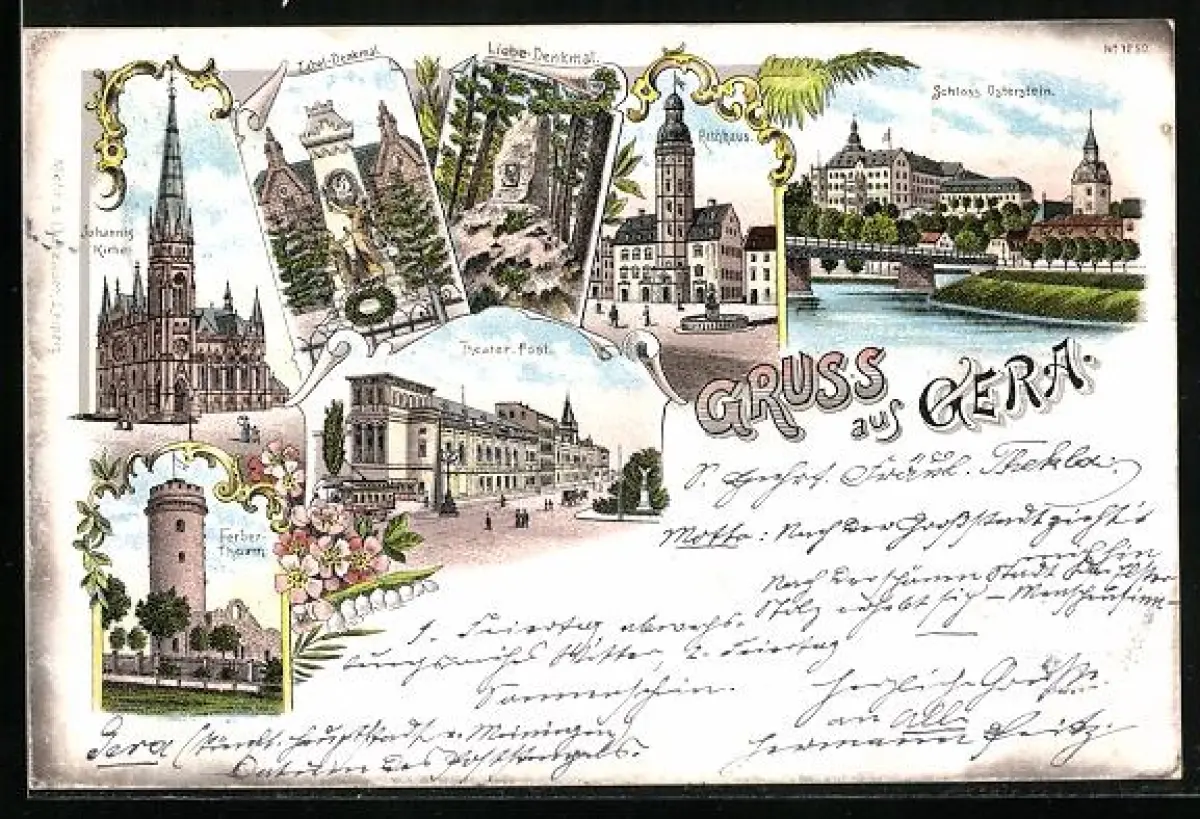 Lithographie Gera, Theater-Post, Liebe-Denkmal, Rathhaus