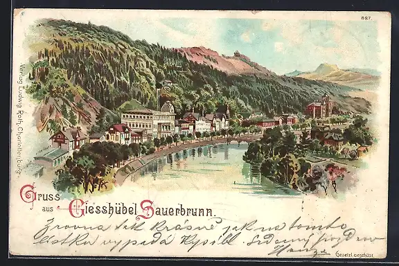 Lithographie Giesshübel Sauerbrunn, Ortsansicht neben Flusspartie