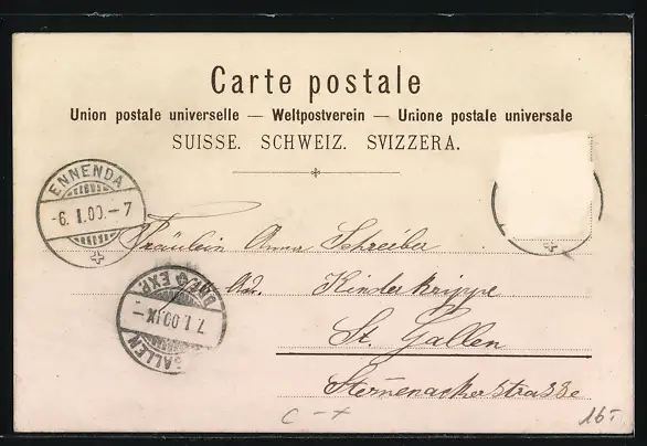 gelaufen 1900, Briefmarke entfernt, rückseitig Oberflächenschaden, Stempelspur, guter Zustand