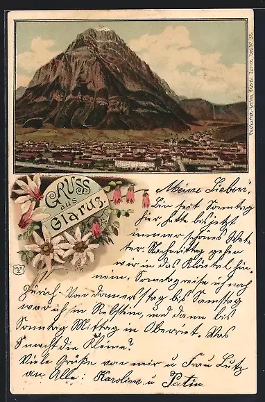 Lithographie Glarus, Ortsansicht mit Berg, Edelweiss