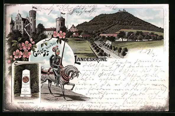 Lithographie Görlitz, Gasthaus Landeskrone mit Burgansicht, Körner Denkmal und Ritter
