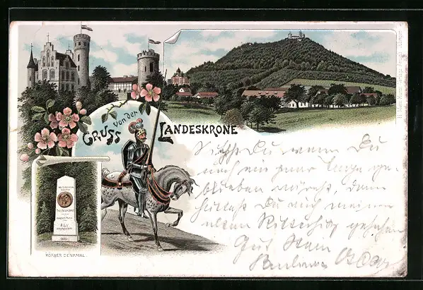 Lithographie Görlitz, Gasthaus Landeskrone mit Burgansicht und Körner Denkmal