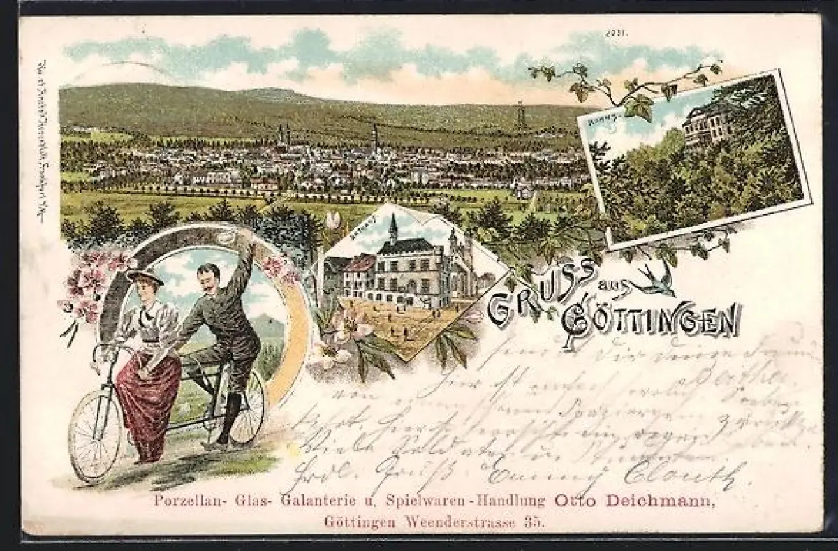Lithographie Göttingen, Haus Rohns, Rathaus, Tandemfahrrad