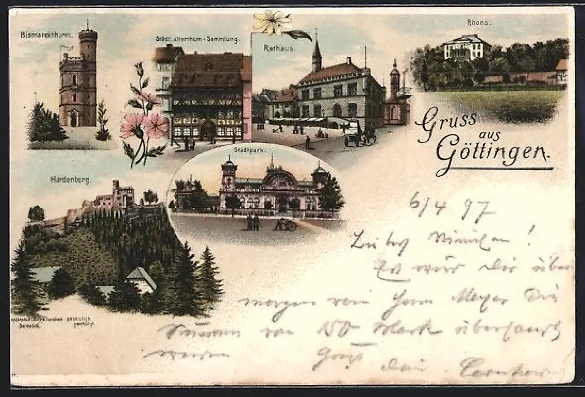 Lithographie Göttingen, Rathaus, Stadtpark, Bismarckturm, Pferdekutsche