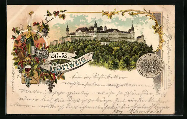 Lithographie Göttweig, Ansicht des Benediktinerstifts mit Sektflasche