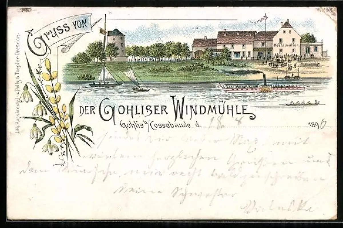 Lithographie Gohlis b. Cossebaude, Gasthaus Gohliser Windmühle, Raddampfer