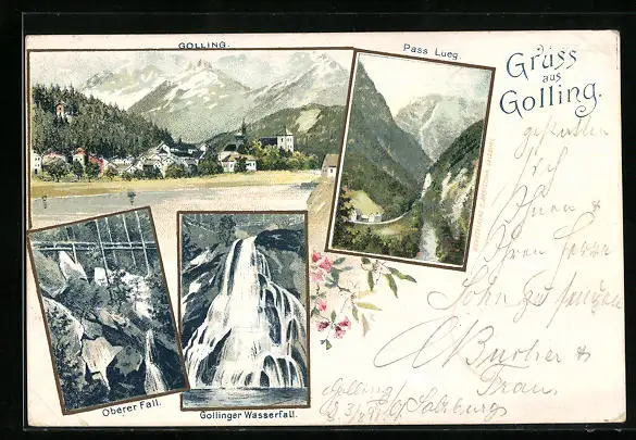Lithographie Golling, Ortsansicht, Pass Lueg, Oberer Fall
