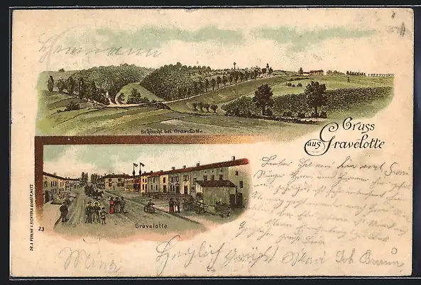 Lithographie Gravelotte, Strasse im Ort, Schlucht bei Gravelotte