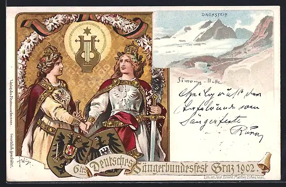 Lithographie Graz, 6. Deutsches Sängerbundesfest 1902, Dachstein, Königspaar, Wappen