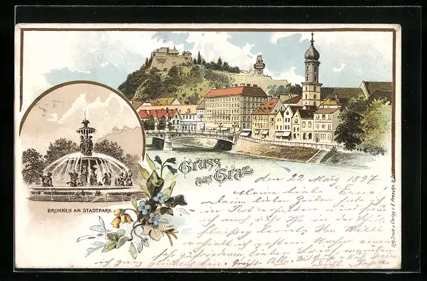Lithographie Graz, Brunnen am Stadtpark, Blick auf Fluss mit Brücke, Häuserzeilen und Kirchturm